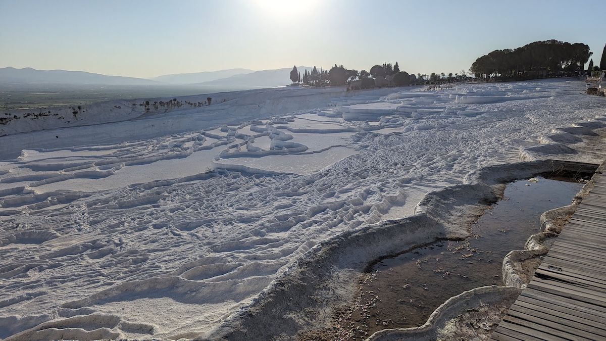Arriving at Pamukkale in the morning, the first thing that caught our attention was the dazzling sweep of white, rising from the plain like a tiered amphitheatre. The travertine terraces, created over thousands of years by mineral-laden hot springs, shone in the sunlight. After having lunch and chilling by at the hotel pool with the rest of the tour group, we made our way up to the terraces at dusk.